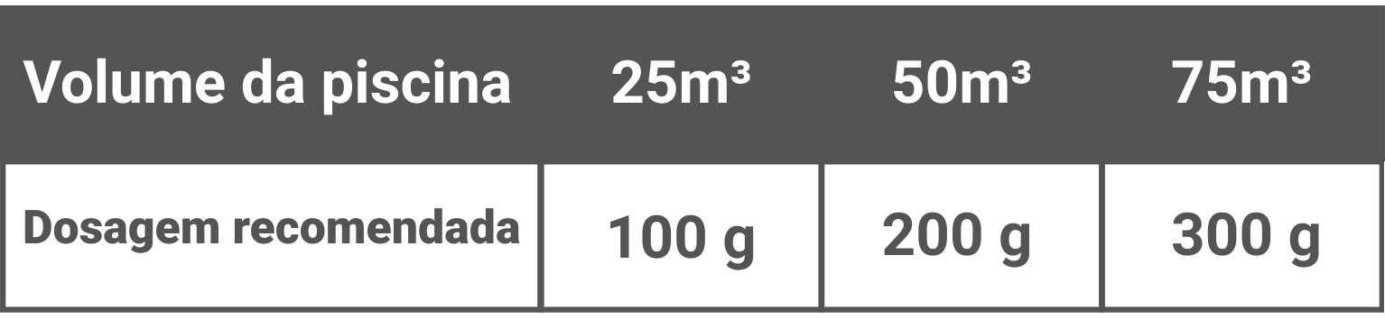 CorrigirDiluição: em um balde limpo com metade do seu volume de água da piscina, dilua 6 ml de Algicida de Choque para cada 1 m³ (1000 litros) de água da piscina.